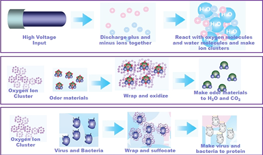 在介质中,离子和自由基会与氧气分子、水分子等发生反应,产生一系列高能离子和自由基。这些高能离子和自由基具有很强的氧化还原作用,可以对空气中的有机物、细菌、病毒等污染物进行氧化分解,达到净化空气的效果